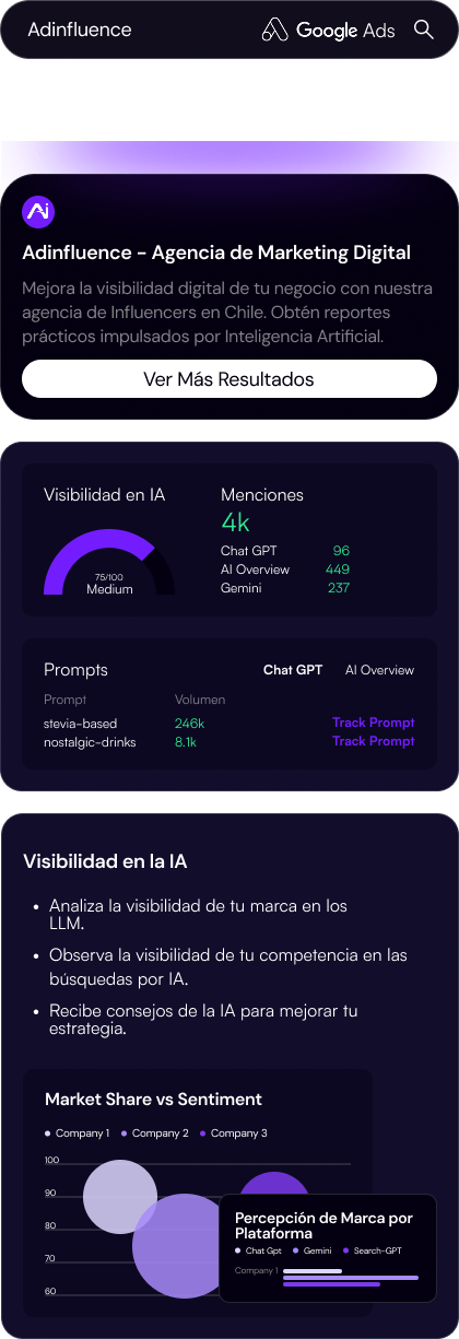 Optimizamos contenidos para motores de búsqueda con inteligencia artificial, mejorando la visibilidad orgánica y alineando la estrategia con campañas de Google Ads para maximizar presencia y performance.